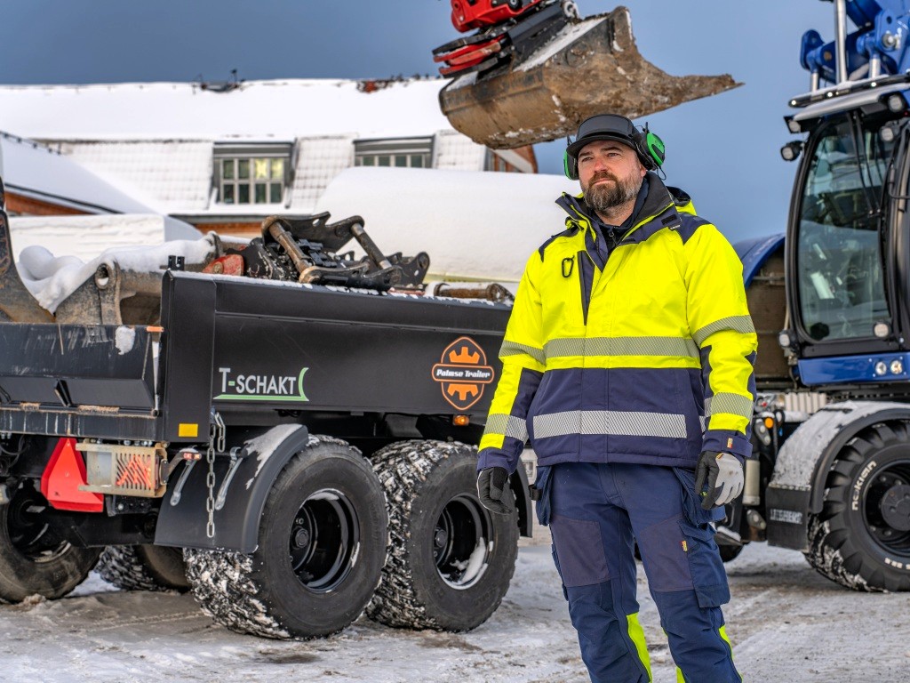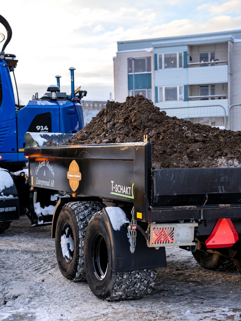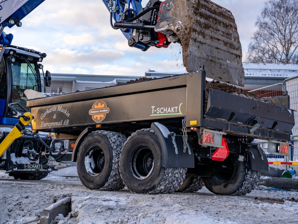 I den arbetsfilosofin har ekipaget blivit en viktig del. Palmse Trailer D900X är i dag en naturlig förlängning av maskinen. Den används för schakt, asfalt, grus, pallar och redskap, allt som behöver flyttas på bygget.