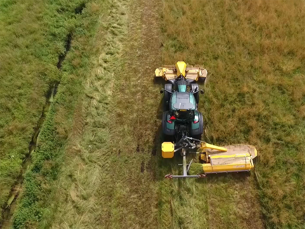 Kör fram och tillbaka för parvisa strängar eller runt åkern för jämna avstånd – maskinen anpassar sig efter din strategi. I kombination med en frontslåtterkross kan du samla material från upp till 12 meters bredd i en enda sträng. Körning moturs minimerar dessutom risken för oklippta ytor i kurvor och hörn.