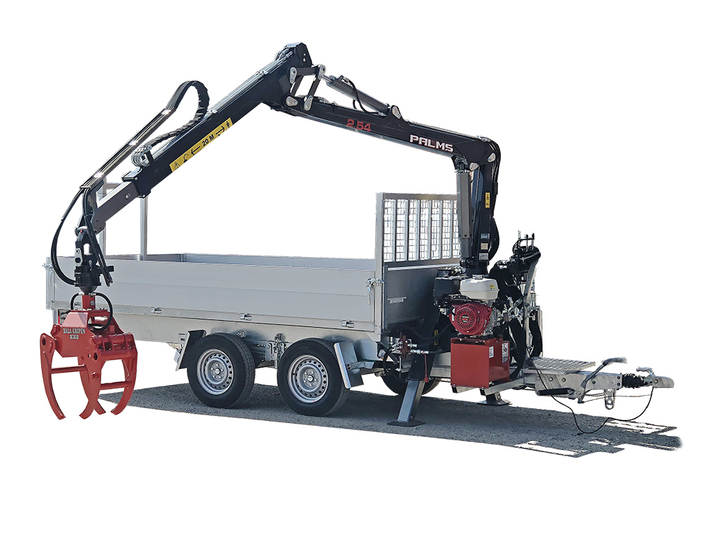 Tillsammans med HWR:s släp levereras Palms 2.54, en smidig och tekniskt avancerad skogskran med teleskopbom och 5,4 meters räckvidd. Med en maxlast på 370 kg vid fullt utskjut klarar den allt från grenar och virke till utrustning – med samma höga kvalitet och teknik som Palms större kranmodeller.