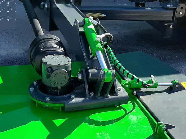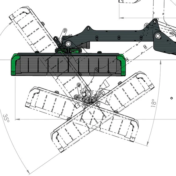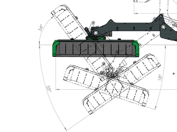 I uppfällt läge avverkar den maximalt, det är då lättare att få in stora buskar och kraftiga stammar. I nerfällt läge skyddar det maximalt om man vill köra längs vägen och inte riskera att matrial slungas ut på bilar.