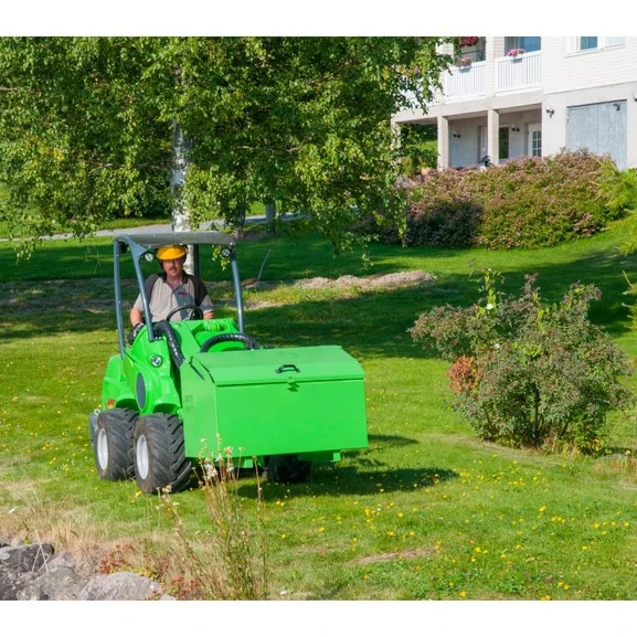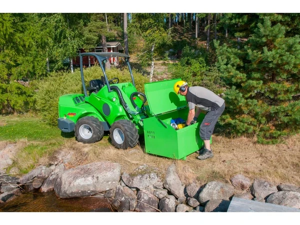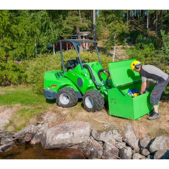 Denna robusta och mångsidiga verktygslåda monteras på redskapsfästet och transporteras med din Avant till arbetsplatsen.
