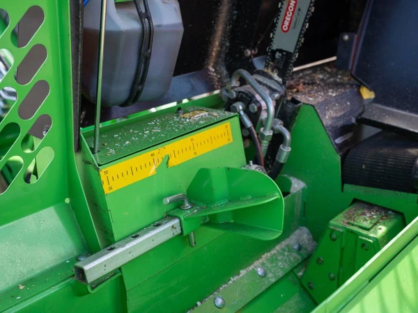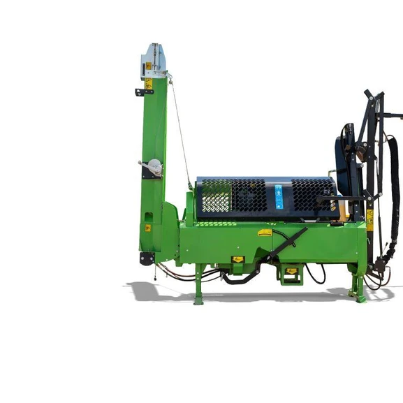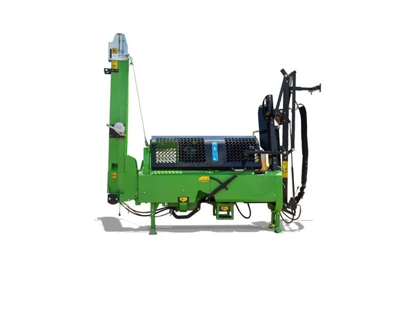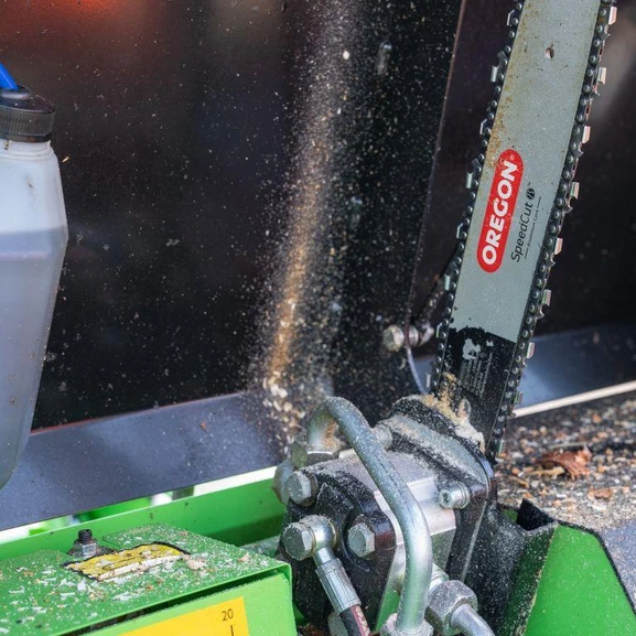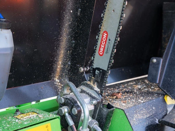 Den hydrauliskt drivna kedjesågen kapar stocken, efter kapning faller stocken automatiskt på klyvbordet där en hydraulcylinder trycker stocken mot klyvyxan. Yxans position kan justeras utifrån vedens diameter. Vedmaskinen är utrustad med smörjsystem från egen oljetank för smörjning av sågkedjan.