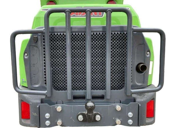 Skyddsgallret täcker och skyddar bakre delen av maskinen och kylaren på motorn. Det monteras med fyra skruvar och är enkelt att installera och ta bort. Skyddsgallret har integrerade surrningsöglor och det är möjligt att montera en kulkoppling eller bakvikt på maskinen som är utrustad med skyddsgallret.