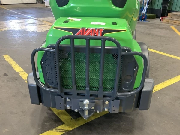 Skyddsgallret täcker och skyddar bakre delen av maskinen och kylaren på motorn. Det monteras med fyra skruvar och är enkelt att installera och ta bort. Skyddsgallret har integrerade surrningsöglor och det är möjligt att montera en kulkoppling eller bakvikt på maskinen som är utrustad med skyddsgallret.