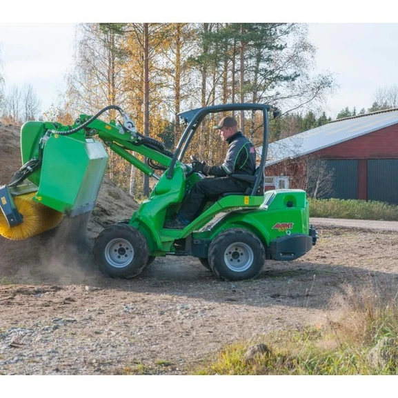 Sopvalsen med skopa är utrustad med en flytlägesmekanism som gör att skopans kant obehindrat kan vila mot marken. Det innebär att lastarens lastararm inte nödvändigtvis måste ha flytlägesfunktion när man arbetar med en sopvals med skopa. Töm uppsamlaren genom att först lyfta upp sopvalsen hydrauliskt och sedan vinkla uppsamlaren nedåt som en vanlig skopa. Borstaxeln är utrustad med ett enkelt snabblåsningssystem för justering av sophöjden.