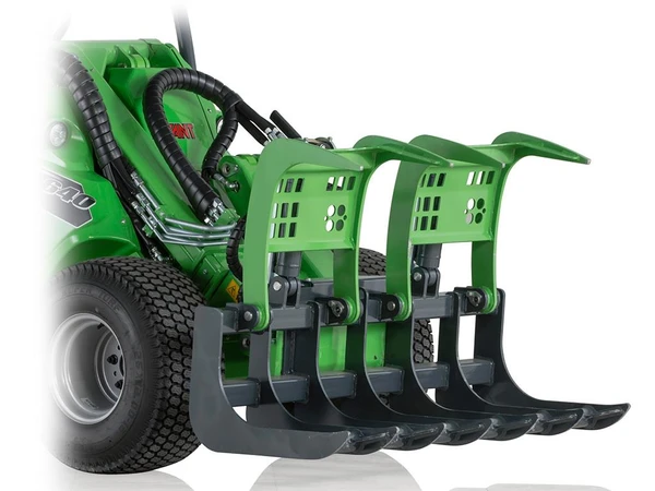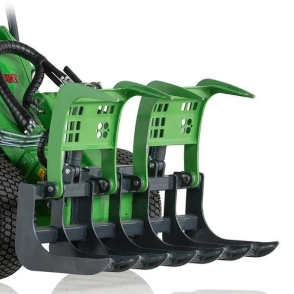 Två modeller tillgängliga: 1300 mm bred med två hydrauldrivna gripar och en smalare 900 mm modell med en grip. Hydraulcylindrarna och slangarna på griparna är väl skyddade med metallhöljen.