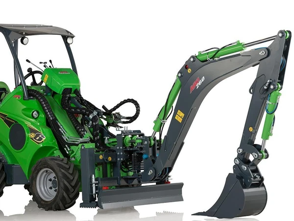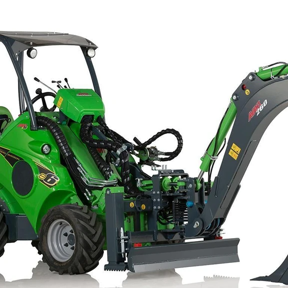 Grävaggregat 260 har som standardutrustning hydrauliska stödben som föraren enkelt kan justera med spaken på aggregatets reglerventil. Detta möjliggör snabb och enkel installation även på ojämn terräng. Byte av skopan är enkelt tack vare snabbkopplingen. Montering av grävaggregatet går mycket snabbt och det fällbara ventilpaketet, med låssystemen på bommen, gör det hela ännu enklare.