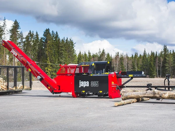 Japa 395TR är en traktordriven vedmaskin med en klyvkraft på 7 ton med möjlighet till 12,5 ton med tillbehör. Maskinen tar en stockdiameter på 40 cm och en längd på 52 cm.