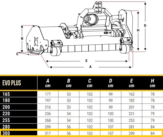 EVO Plus 300 har en arbetsbredd på hela 2,99 m och klarar att bearbeta sly upp till Ø 40 mm när den är utrustad med hammarslagor (kan även väljas med Y-slagor). Klipparen har en kraftig trepunktsram som går att få med inbyggd mekanisk eller hydraulisk sidoförskjutning. Den kompakta och mycket starka konstruktionen gör att de lämpar sig för traktorer från 90 – 120 hk.