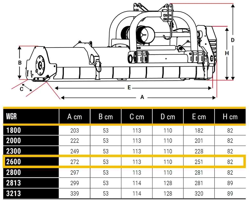 WGR är en kraftig betesputs byggd för putsning av gräs, majsstjälkar och sly upp till hela Ø 80 mm. WGR 2600 har en arbetsbredd på 2,51 m och är utrustad med hammarslagor på 2,1 kg (kan även väljas med Y-slagor). Klipparen har en kraftig dubbel trepunktsram med inbyggd hydraulisk sidoförskjutning på 60 cm. Serien lämpar sig för traktorer från 65-140 hk.