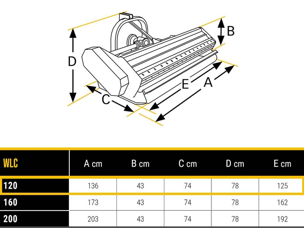 WLC 120 är den minsta betesputsen i serien med en arbetsbredd på 1,20 m, och den klarar att bearbeta sly upp till Ø 30 mm när den är utrustad med hammarslagor (kan även väljas med Y-slagor). Klipparen har en rejäl trepunktsram och hydraulisk sidoförskjutning på 27 cm i standardutförande. Den kompakta och mycket starka konstruktionen gör att den lämpar sig för traktorer från 25-50 hk.