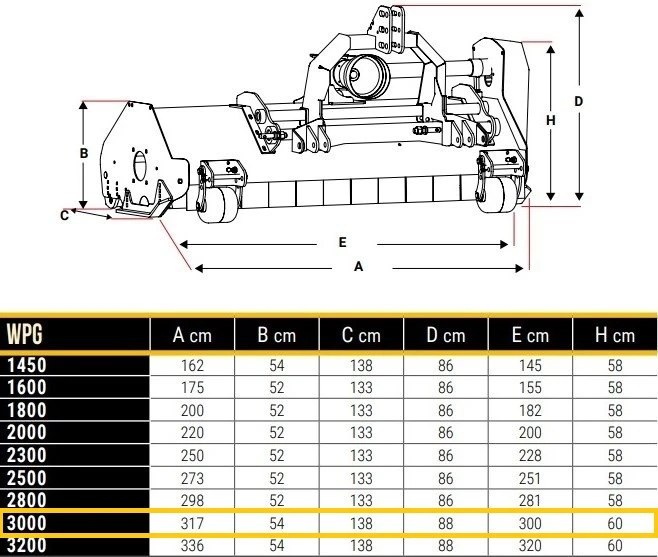 WPG 3000 har en arbetsbredd på 2,99 m och klarar att bearbeta sly upp till Ø 30 mm när den är utrustad med hammarslagor (kan även väljas med Y-slagor). Klipparen har en rejäl 3-punktsram som har hydraulisk sidoförskjutning standardutförande. Den kompakta och mycket starka konstruktionen gör att de lämpar sig för traktorer från 75-100 hk.