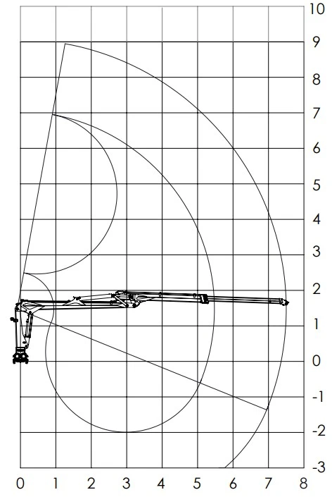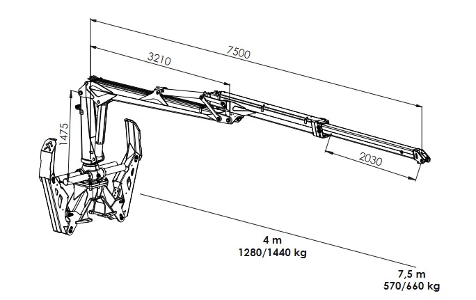 Palms skogskran 5.75 är en kran med teleskopbom och med en räckvidd på 7500 mm. Maxlasten när bommen är fullt ute är 660 kg.